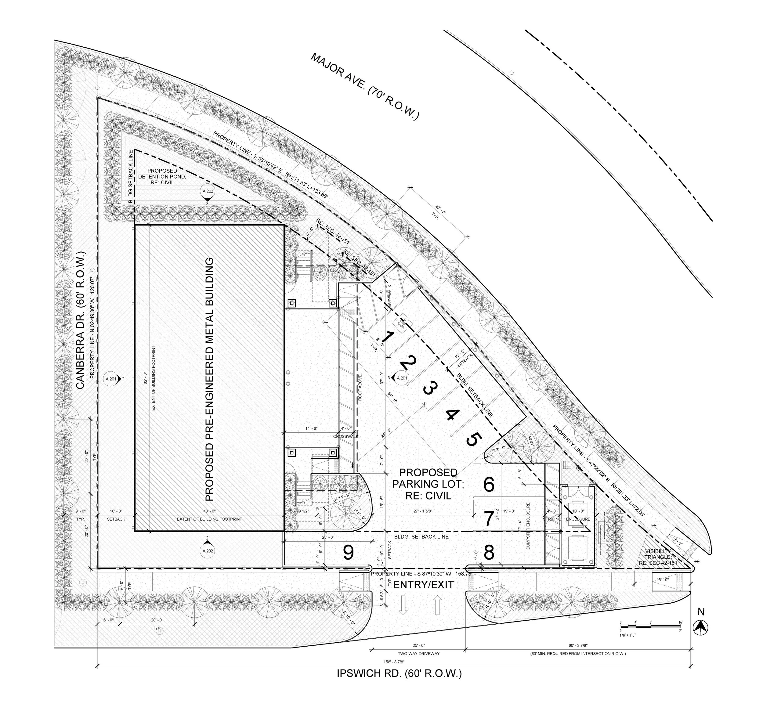 During pre-development meetings with the City permitting office, it became clear that the site’s geometry—specifically the curved radius along the hypotenuse—created sight-line problems for oncoming traffic. As a result, access from the north street was not permissible. This constraint required that all vehicular access be established along the south frontage.